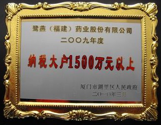 2010年3月23日,廈門湖里區(qū)人民政府召開(kāi)2009年度納稅先進(jìn)企業(yè)表彰大會(huì),并公布2009年度納稅先進(jìn)企業(yè)名單,鷺燕集團(tuán)核心成員企業(yè)鷺燕(福建)藥業(yè)股份有限公司光榮登榜。自2006年以來(lái)鷺燕集團(tuán)已連續(xù)四年獲得納稅大戶(1000萬(wàn)以上)榮譽(yù)稱號(hào)。