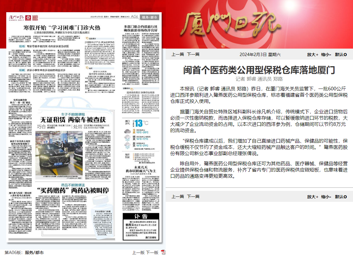 2024年2月2日,鷺燕醫(yī)藥公用型保稅倉獲批投用,《福建日報》《廈門日報》相繼報道相關(guān)新聞。鷺燕醫(yī)藥公用型保稅倉是福建省首個醫(yī)藥類公用型保稅倉庫,該保稅倉庫的投用,意味著廈門市乃至福建省補齊了區(qū)域內(nèi)專門的醫(yī)藥保稅供應(yīng)鏈物流服務(wù),也意味著廈門和福建進口藥品的通路變得更短,更為高效。