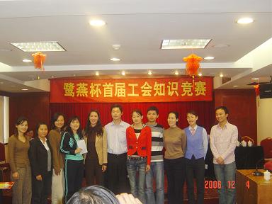 廈門鷺燕大藥房有限公司于2006年12月3日在廈門廬山大酒樓隆重舉行鷺燕杯首屆工會知識競賽,此次工會知識競賽由6個工會小組各自選派4名選手參加,比賽環(huán)節(jié)包括團(tuán)隊介紹、啦啦隊互動、演講比賽、必答題、搶答題、猜詞秀、才藝表演等,形式多樣、內(nèi)容豐富。比賽現(xiàn)場還邀請了一些供應(yīng)商的代表作為嘉賓評委,為比賽進(jìn)行現(xiàn)場點評及頒獎。